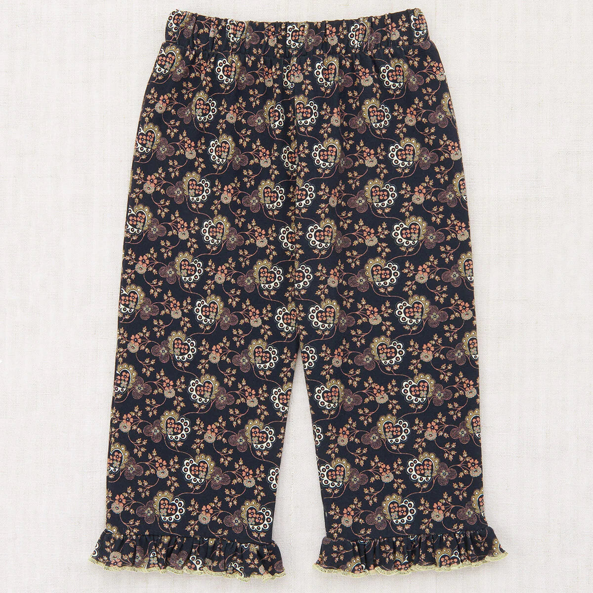 A roomy pull-on pant in organic Pima cotton, featuring a mid-calf length, gathered elastic waistband, and contrast merrowed edge ruffle hem.