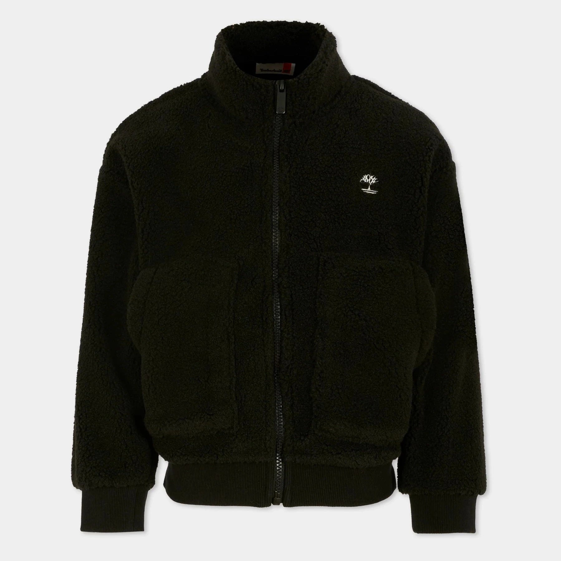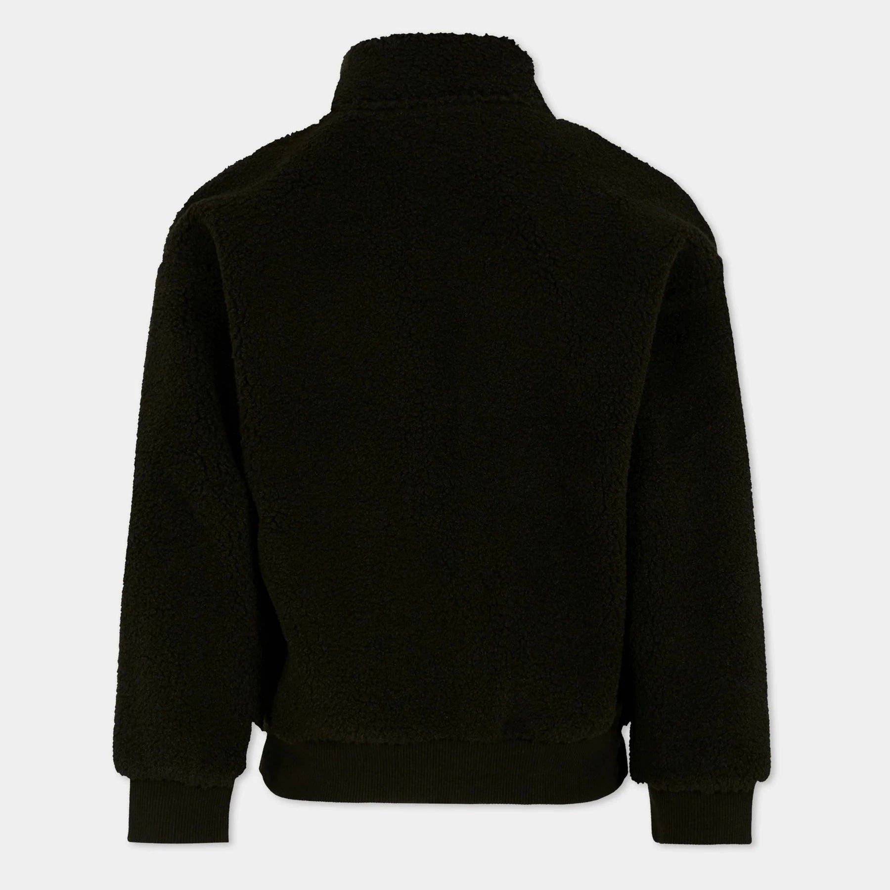 Black eco-fur long-fur, with crew neck, front zip closure, side pockets, cuffs and ribbed hem. It is decorated with embroidered logo on the chest.