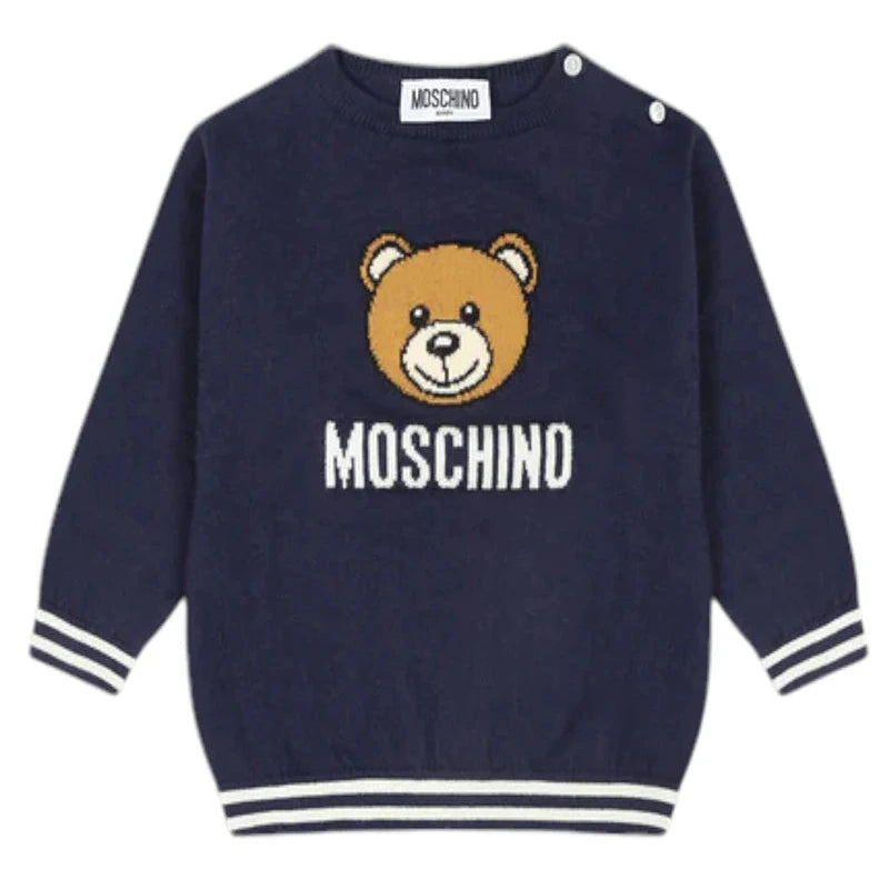 This cotton and wool blend crew neck jumper is perfect for winter. With long sleeves, button fastening and ribbed trims, it keeps you warm and comfortable. The Teddy intarsia and logo detail on the front add a touch of style. Composition: 85% Cotton, 15% Wool.